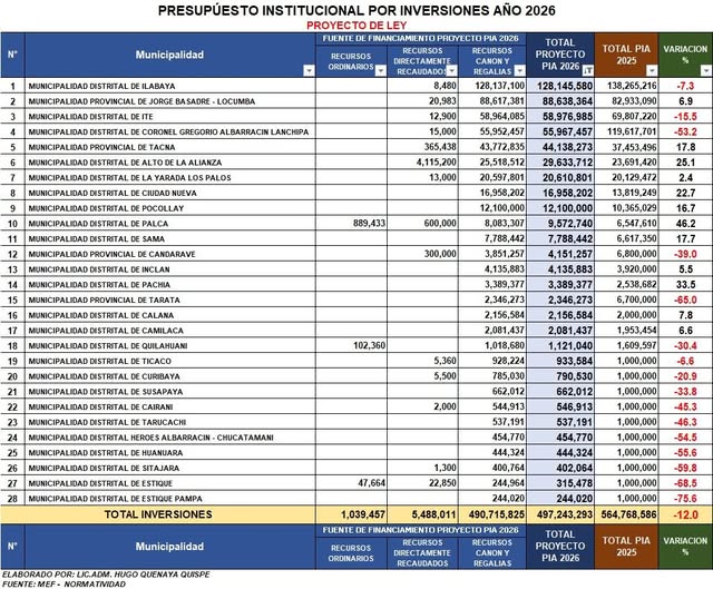 PRESUPUESTO INSTITUCIONAL 2026 DE MUNICIPIOS PARA INVERSIONES ES MENOR EN 12.0% CON RESPECTO AL PIA INVERSIONES 2025