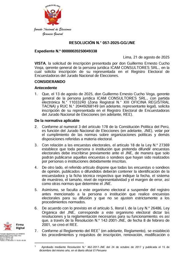Según RESOLUCIÓN N.° 057-2025-GG/JNE , Expediente N.º 00000020250049338, con fecha 21 de agosto de…
